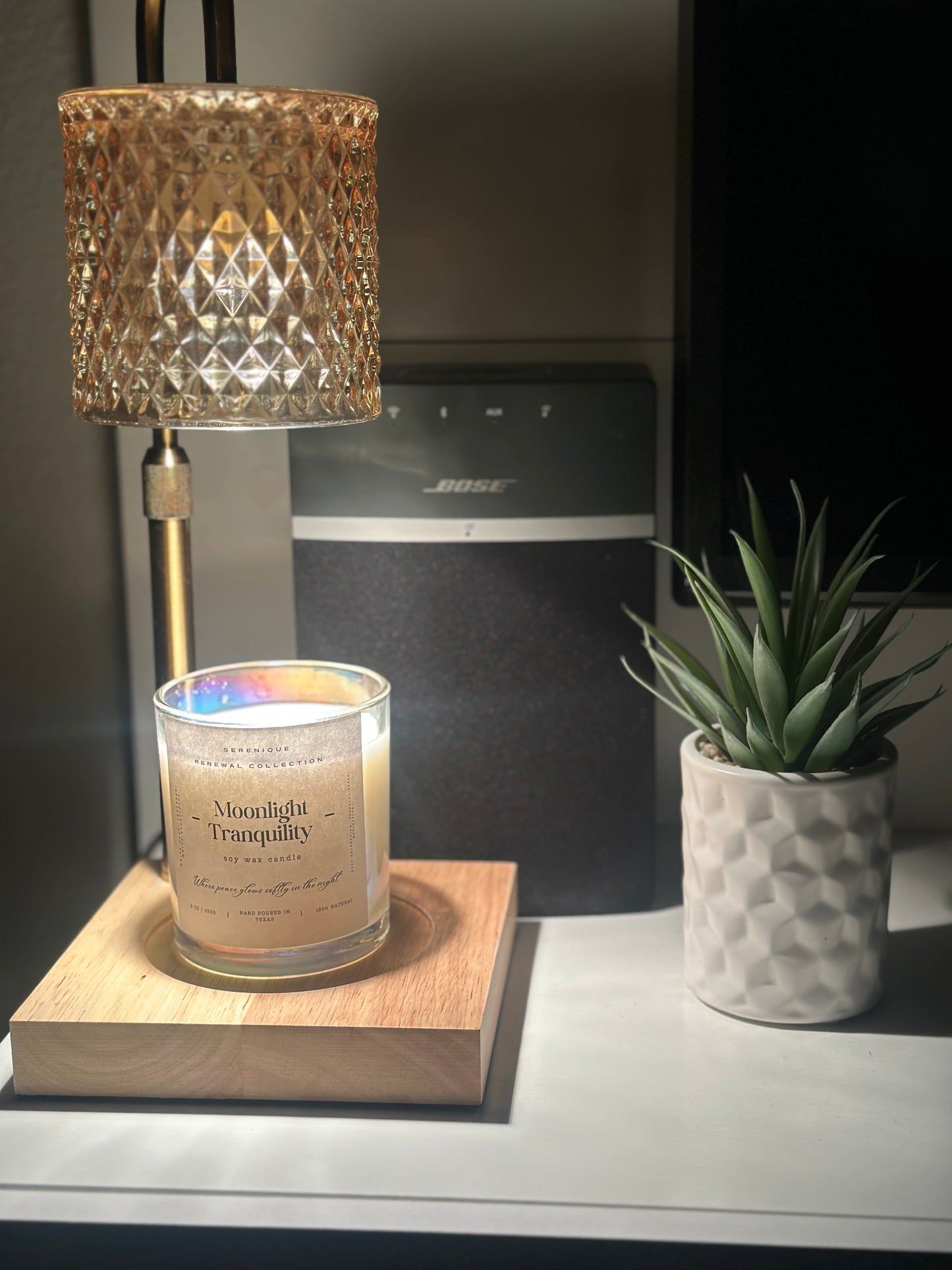 And let’s talk about the presentation for a sec. I picked up one of their modern- chic candle warmers—super minimal, but with just enough personality to stand out. It pairs perfectly with Serenique’s beautiful glass jars, and the soft, amber glow from the warmer adds this serene elegance to the whole setup. Honestly, it’s become a little sanctuary/serenity corner.